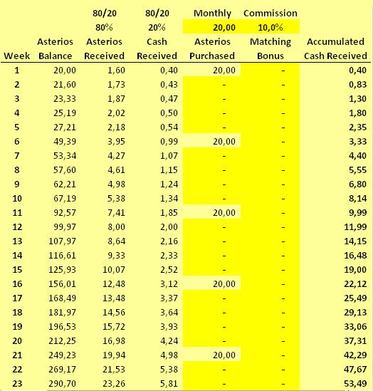 Se poate vedea clar, că în prima săptămână prin adăugarea la taxa de 20 $ a celor 80% vei avea 21,6 puncte (asterios) și 0,4 $. În săptămâna următoare pornești de la 21,6 puncte, din care se vor face 23,33 în dimineața de vineri din a doua săptămână, și așa mai departe. După cum se poate vedea din tabel, după a 20-a săptămână sistemul tău se auto-susține și din a 40-a săptămână te poți aștepta la un venit pasiv de aproximativ 100 $. Și din acest moment începe să pornească cu adevărat afacerea, căci câștigul punctelor mari va induce un randament și mai mare. Dacă te uiți în continuare în tabel, se vede clar că avansând în timp câștigurile săptămânale îți cresc tot mai mult, într-un caz optim la sfârșitul săptămânii a 75-a vei atinge un venit maxim săptămânal de 400 $, care calculând după actualul curs valutar, înseamnă 1200 lei pentru tine. Veniturile, de la 10 $ in sus le poți scoate săptămânal.